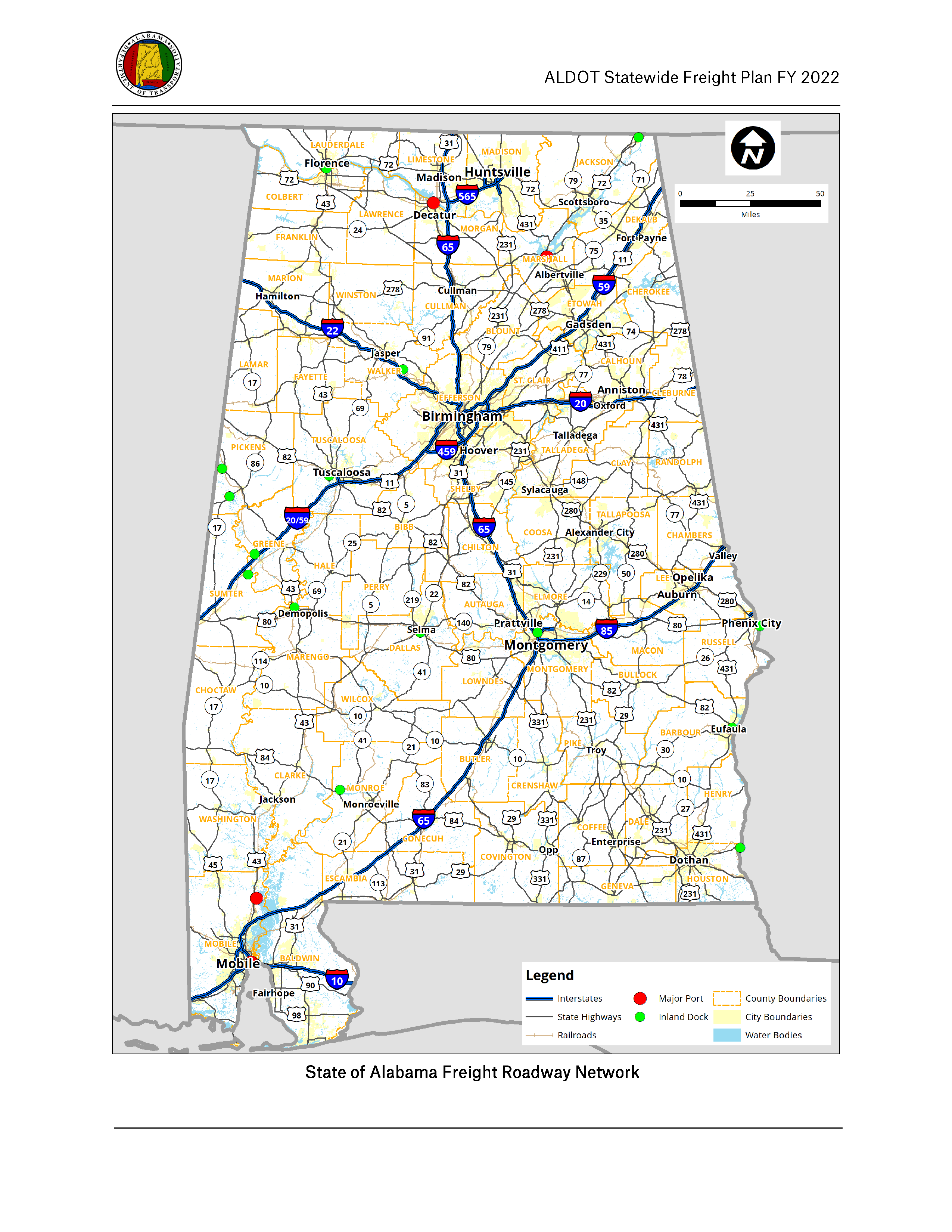 This map depicts the entire State of Alabama Freight Roadway Network. More information on the State of Alabama Freight Roadway Network can be found on the FHWA Freight Infrastructure for Alabama's website
